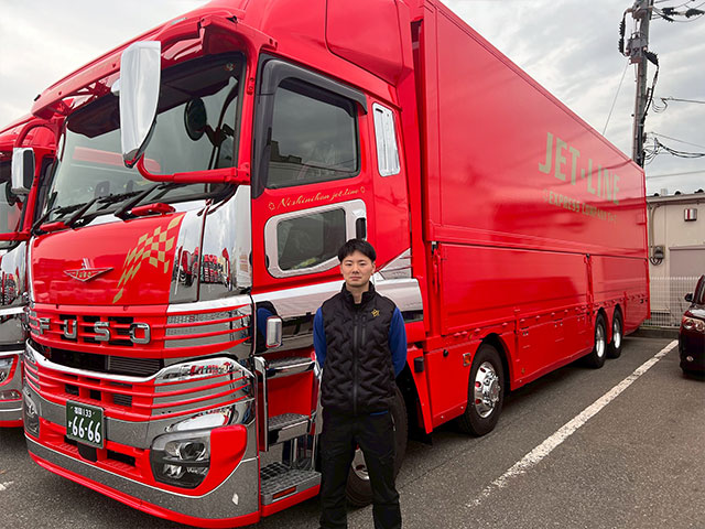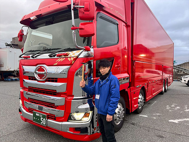 かっこいいトラックに乗れることに魅力を感じ入社しましたが、実際に働いてみると先輩方が優しく丁寧に教えてくれる温かい職場で、安心して成長できる環境だと実感しています。