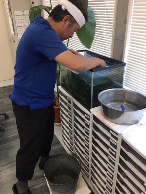 原口課長がメダカの水槽の水換え&掃除をしていました>゜)))彡